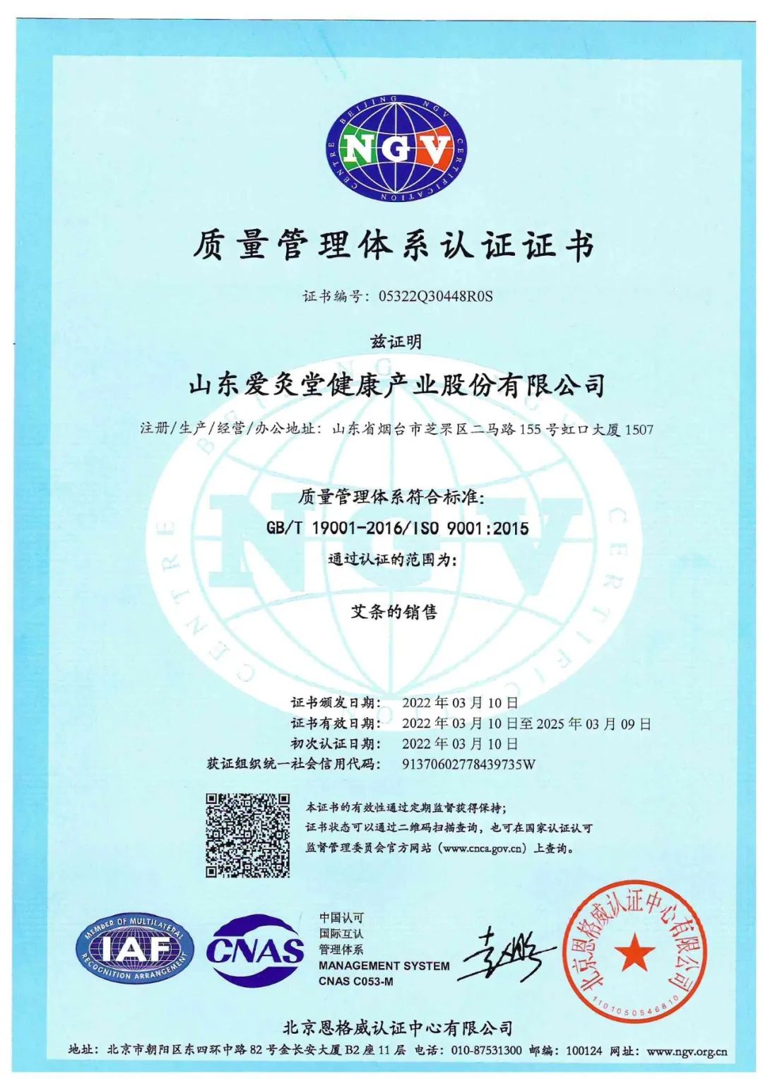 山東愛灸堂健康產(chǎn)業(yè)股份有限公司順利通過了質(zhì)量認證中心的專項審核,正式獲得ISO 9001:2015質(zhì)量管理體系認證證書,這標志愛灸堂在程序化和標準化方面取得了新的進展。